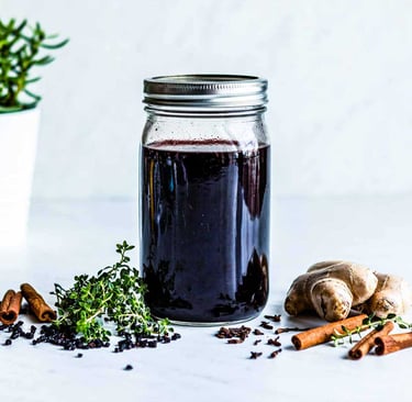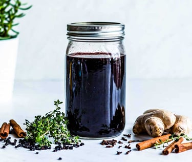 Rich, dark elderberry syrup in a glass jar, surrounded by complementary herbs, inviting a sip of seasonal fortification.
